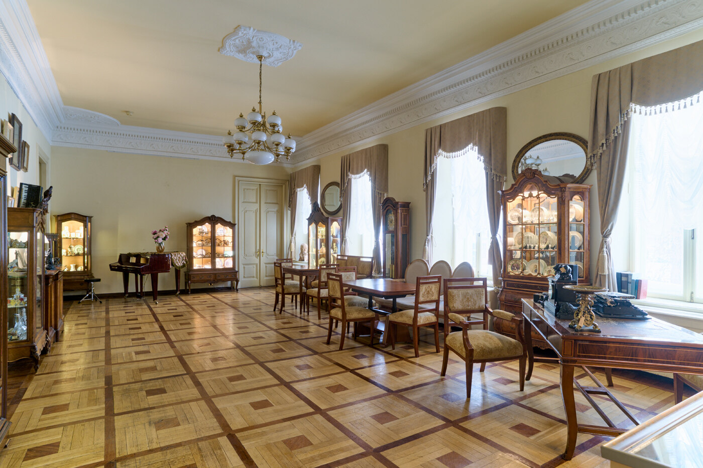 В парадных залах особняка воссозданы интерьеры соответствующие духу 19 века, представлена мебель, живопись, фарфор, часы, предметы декоративно-прикладного искусства, многие из которых можно купить.